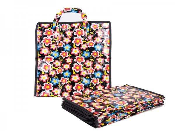 Model: 0007- Flowers/Black/Red set 12 Set of twelve polyester strong reusable shopping bags. It has two carry handles and a zipped opening across the top. Approx. measurements: Size 36 x 39 x 19 cm Weight 0.08kg each Bar 5019758000076