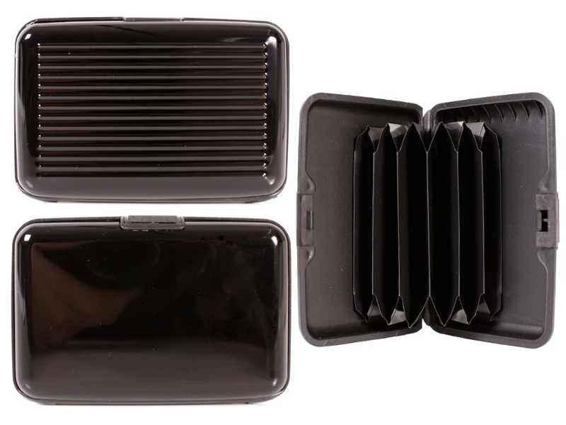 Metallic hard case credit card holder with concertina holder for cards.