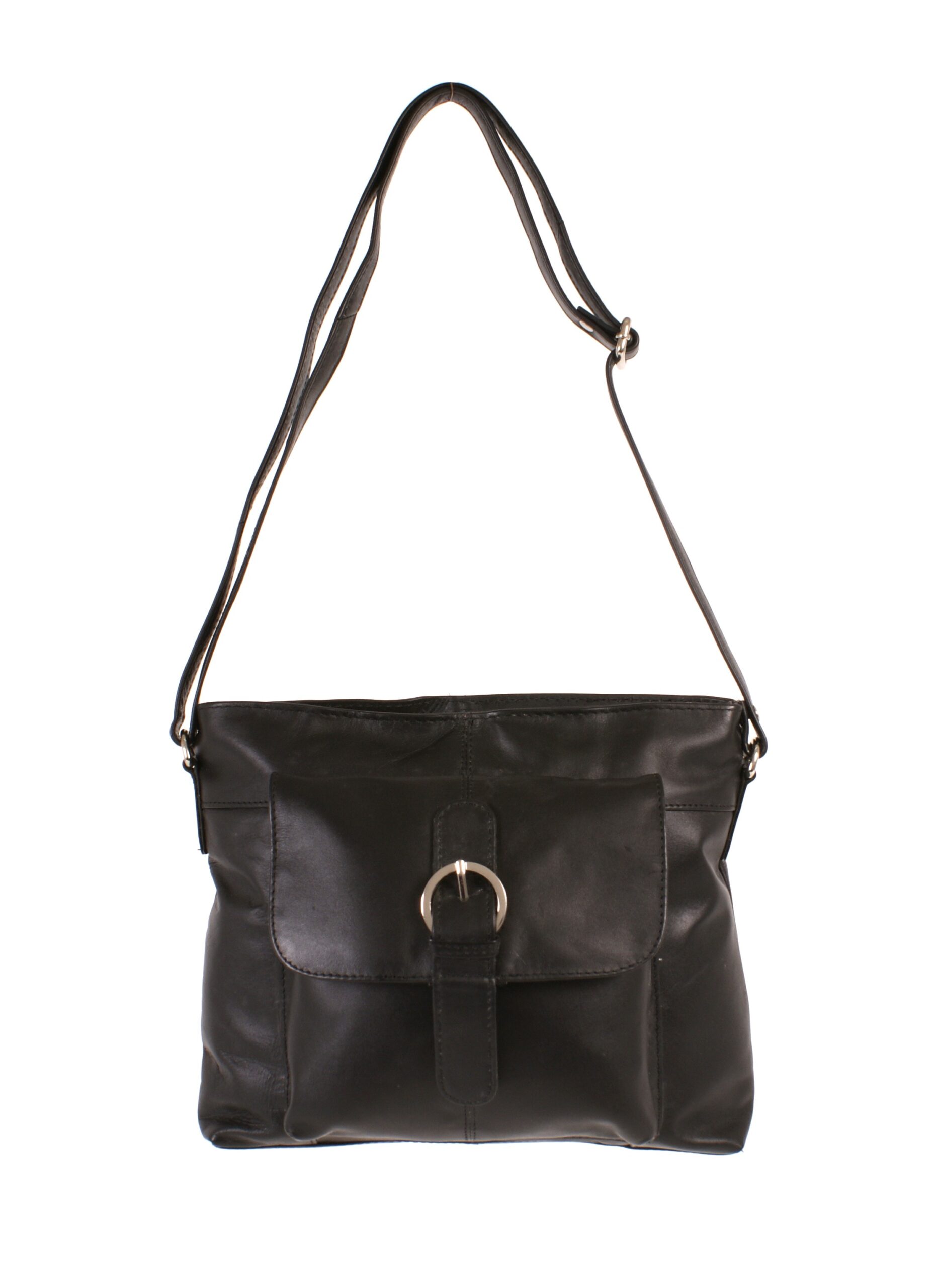 Fine Italian leather handbag with magnet flap pouch, adjustable shoulder strap and rear pocket. Fully lined with an inside zipped pocket.