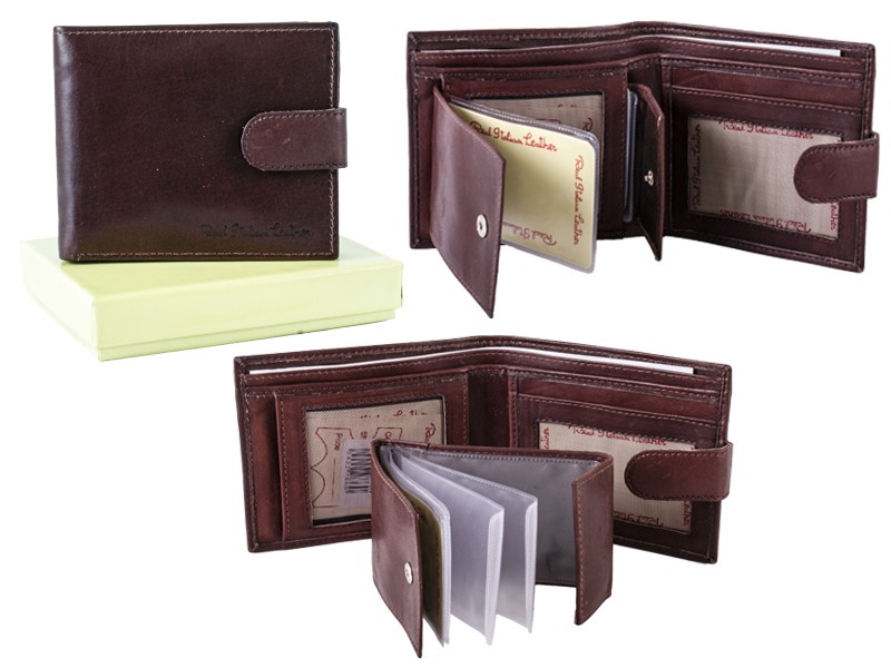 Real Italian Leather mens bi-fold wallet with popper fastening. Features multiple card slots, 2 mesh ID windows, two note sections and a zip pocket in the notes section. Comes in a presentation box.