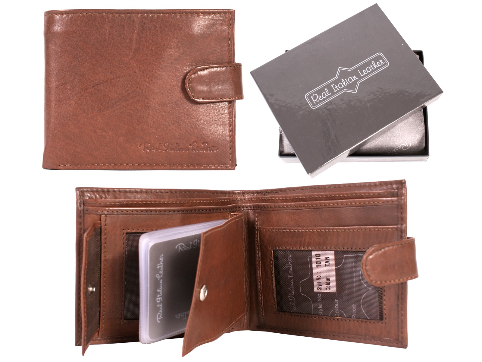 Real Italian Leather mens bi-fold wallet with popper fastening. Features multiple card slots, 2 mesh ID windows, two note sections and a zip pocket in the notes section. Comes in a presentation box.