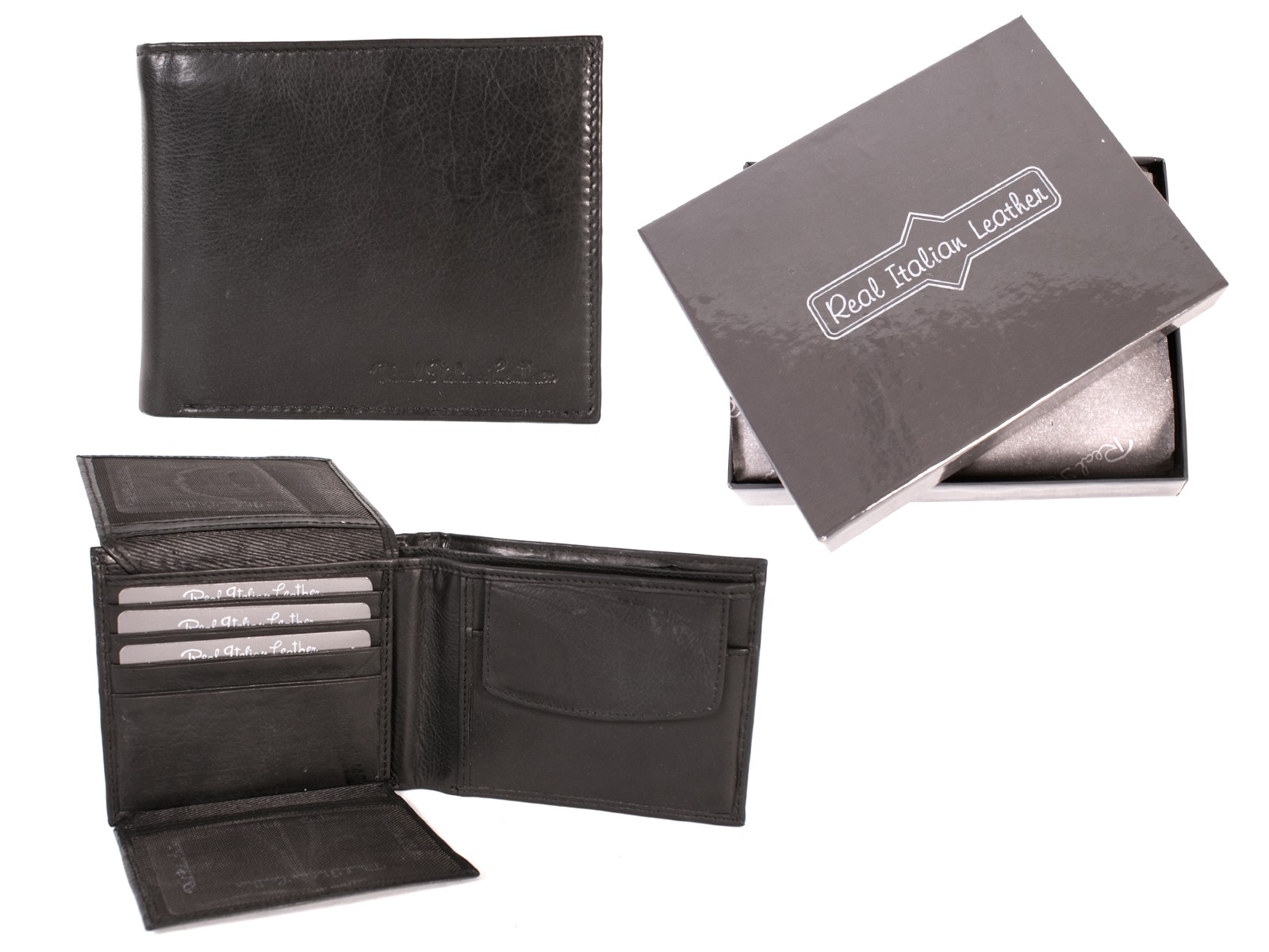 Real Italian Leather mens bi-fold wallet with multiple card slots, 3 mesh ID windows, a popper fastening coin pocket and two note sections. Comes in a presentation box. Dimensions: Height 9cm Width 11.5cm Depth 1.5cm