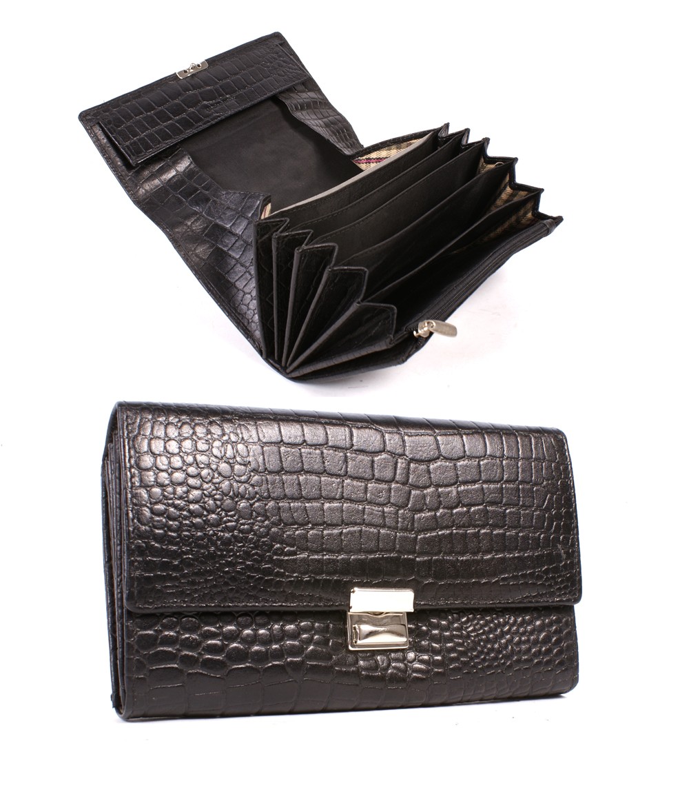 Real leather wallet woth croc effect featuring a coin purse, compatment for cash and cards. Lined with a burberry type pattern inside.