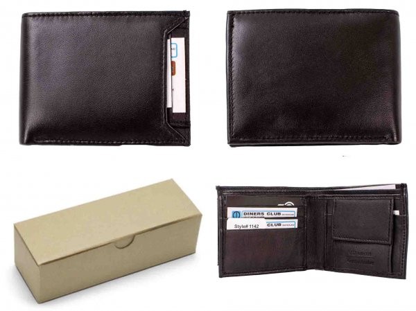 Model: 1142 RFID BLACK BOX OF 12 WALLET 1142 RFID BLACK S. NAPPA NOTECASE WITH C. CASE BOX OF 12 WALLET SINGLE UNIT DESCRIPTION -100% RFID protection from digital theft -5 card slots with 2 open slots under it. -1 coin pocket -1 ID window -2 Main compartment for notes -REMOVABLE CARD CASE EACH BOX CONTAINS 12 BLACK WALLET BARCODE: 5038756001526 DIMENSION: 11 cm x 9 cm FULLY OPEN: 23 CM MATERIAL: GENIUNE LEATHER Product 753/7440
