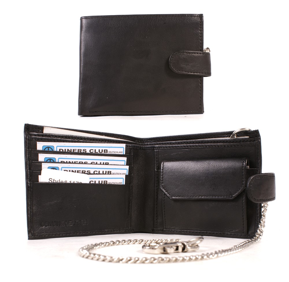 Leather wallet with chain, card pockets, two notes pockets and press stud pocket. Size L13 cm x W2 cm x H9.5cm.