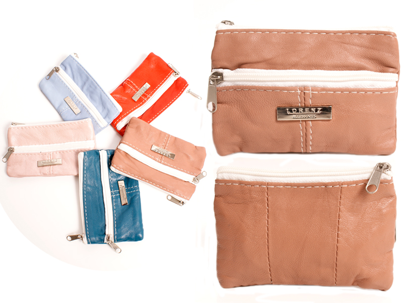 Small leather Lorenz Accessories zipped coin purse two compartments. Features a key ring inside.