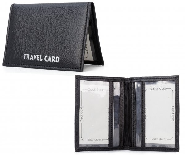 This black PU wallet has four interior sleeves for holding travel cards.