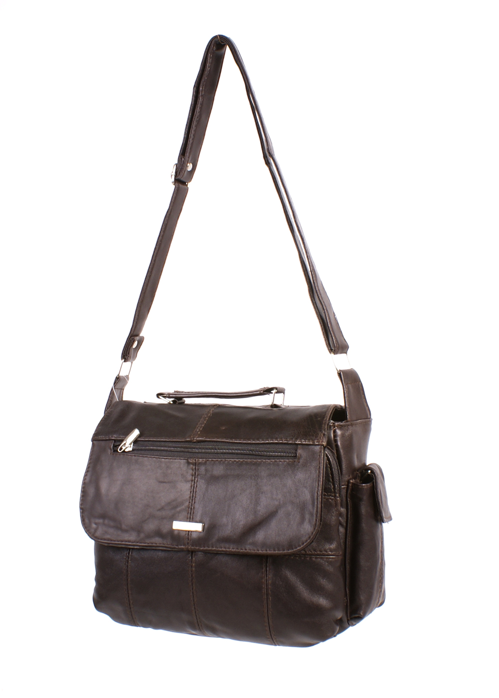 Lorenz soft leather handbag with one main compartment with divider zip compartment in the middle, small zip pocket and two pouch pockets inside under a magnetic snap fastening flap. Features a front zip pocket under the flap and zip pocket on the flap. Also features a rear zip pocket a velcro fastening mobile phone side pocket, top grab handle and an adjustable shoulder strap.