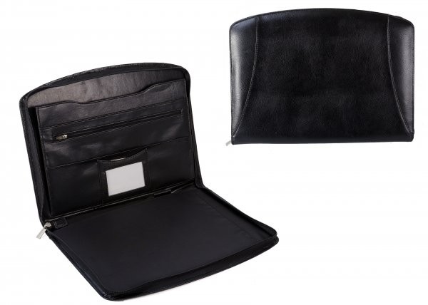 Pu folio holder with one main compartment, accessed by unzipping all around the case. It has a section for holding a hardback notepad and then a divider section for documents and accessories.