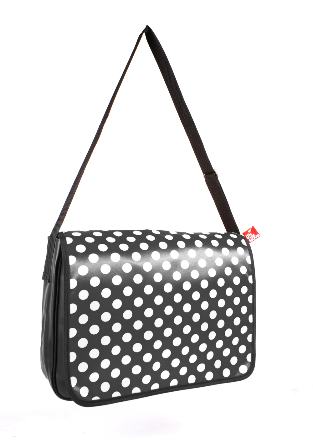 Polka dot pattern college bag with a large front pocket and adjustable shoulder strap.