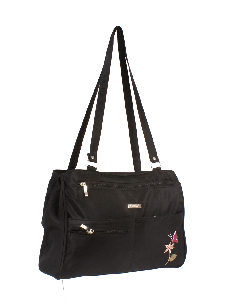 A Lorenz microfibre handbag with 3 front zipped pockets, belt straps around the side and a large zipped main compartment.