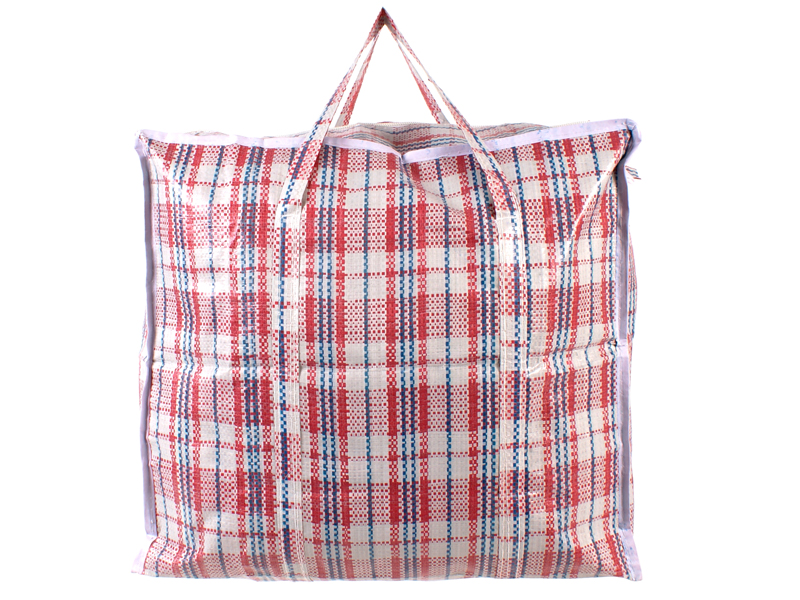 Small check laundry/storage bag with one main zip compartment and two grab handles.