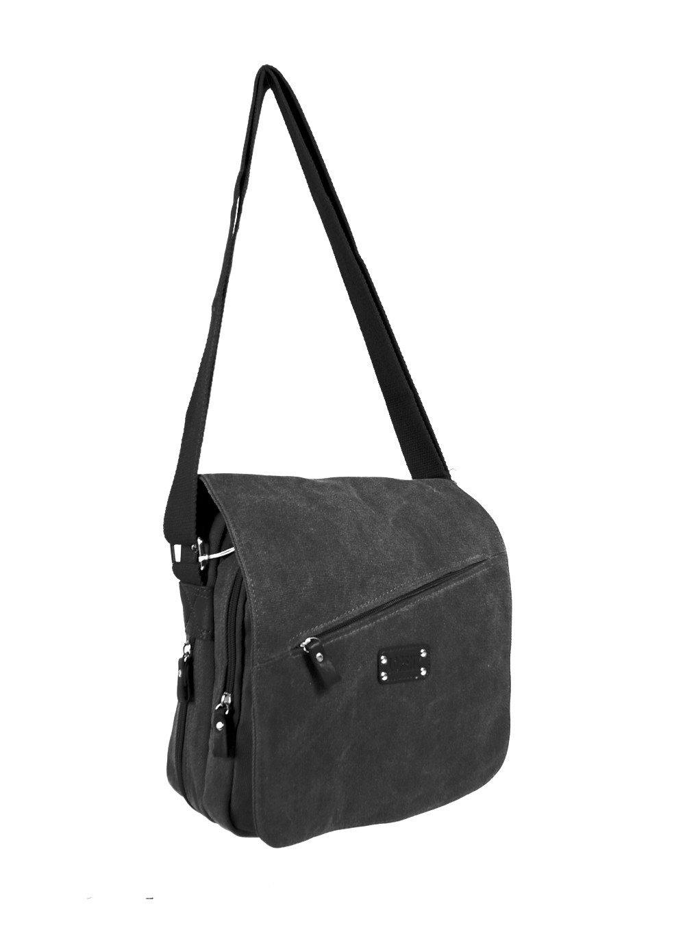 Canvas shoulder bag with zipped pocket on front flap. Bag has one main section with a front and back zipped pocket. Pouches inside the bag and has an adjustable shoulder strap.