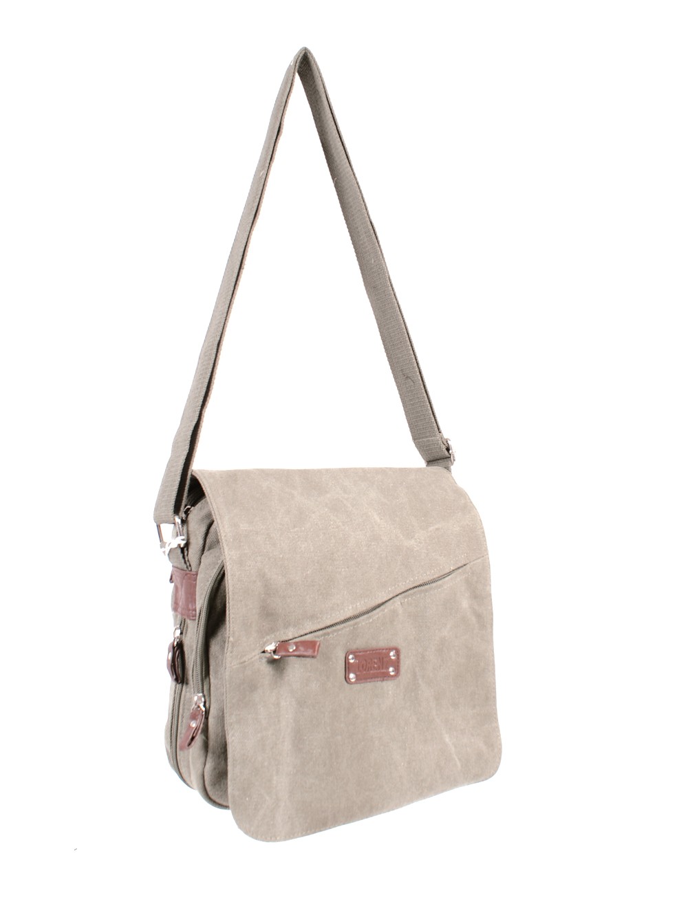 Canvas shoulder bag with zipped pocket on front flap. Bag has one main section with a front and back zipped pocket. Pouches inside the bag and has an adjustable shoulder strap.