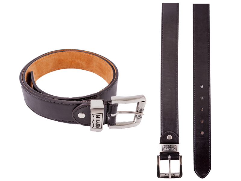This is a brown Milano leather belt. It has a prestige belt buckle with the words Milano engraved into it. It also has five holes so you can adjust the belt to the desired length.