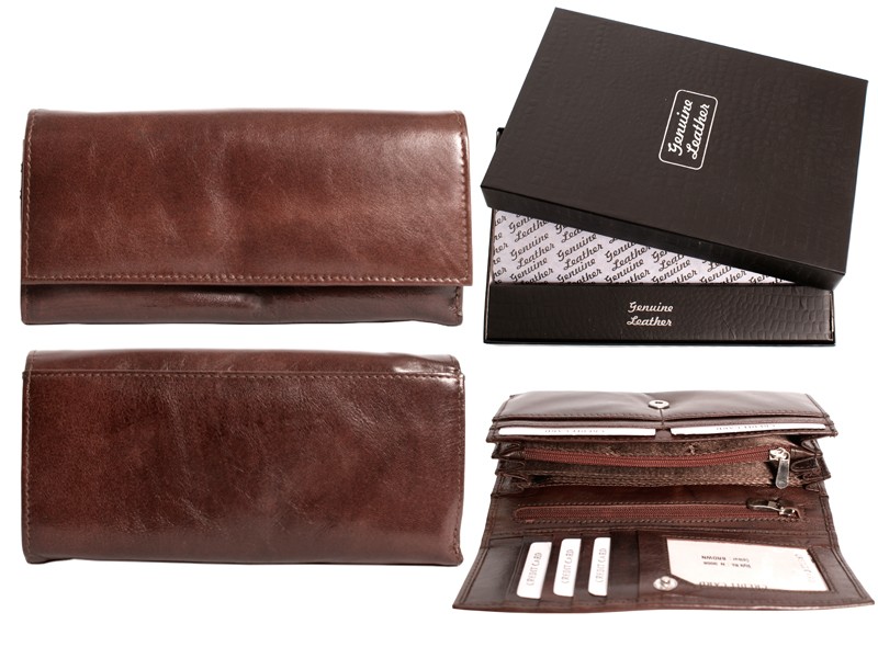 Genuine leather ladies purse with stud press closure, multiple card slots and an ID window. Features a zip section, 4 note sections, a large zipped coin section inside and a slide in pocket at the back. Comes in a presentation box.