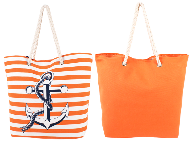 Beach bag with magnetic popper fastening main compartment with rope grab handles.