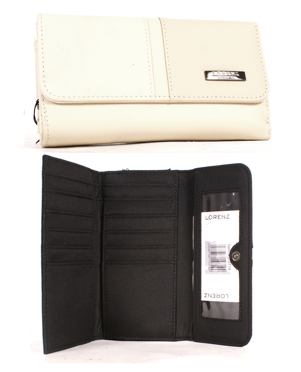Large leather Lorenz purse with microfibre interior, card slots, ID window and cash slots and large snap top coin purse on the back of the purse.