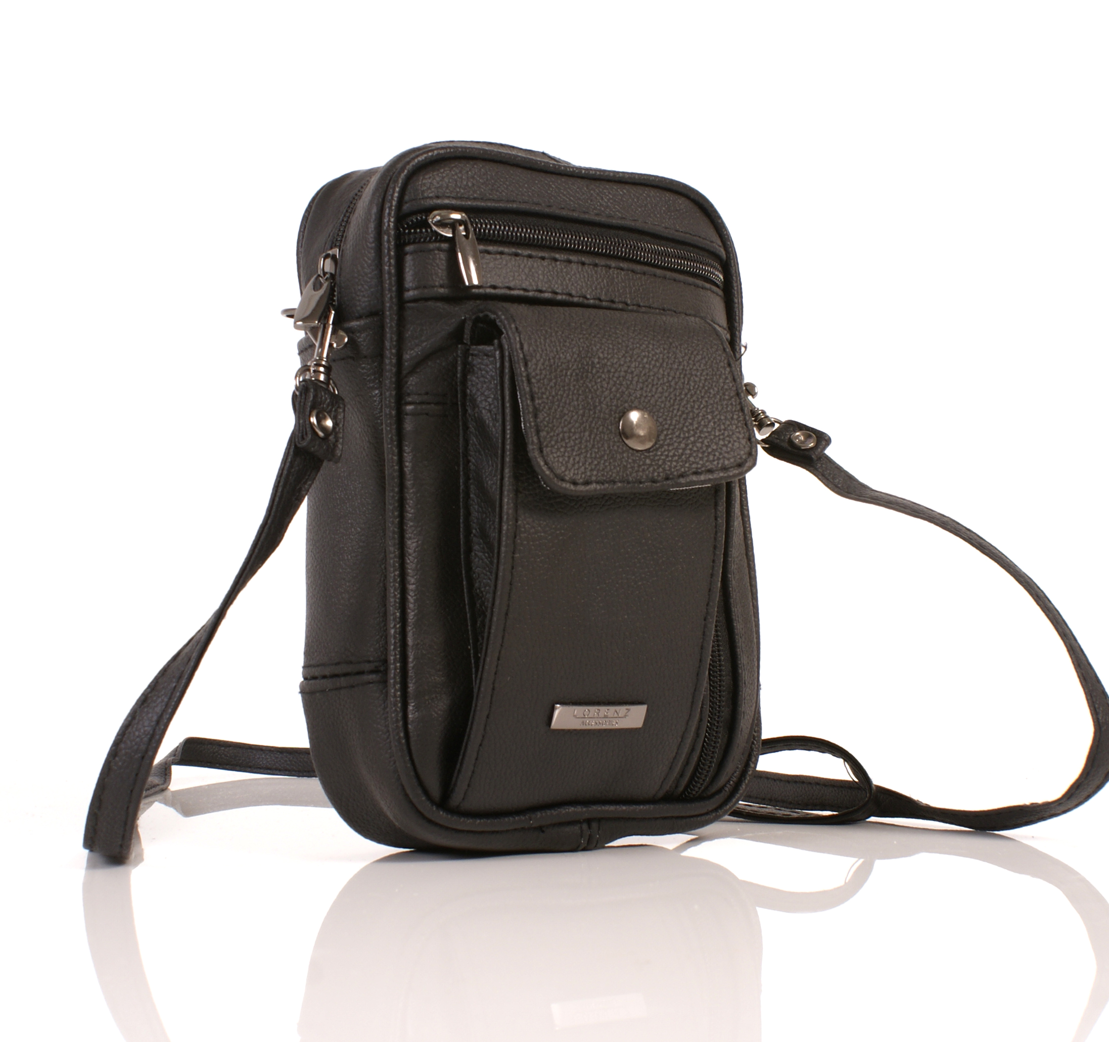 A ‘Lorenz Accessories’ real leather small carry bag with mobile phone case attached to the bag and a vertical and a horizontal zipped pocket on one side. Main zipped compartment and another zipped pocket on the other side. Features a carry strap and a shoulder strap.