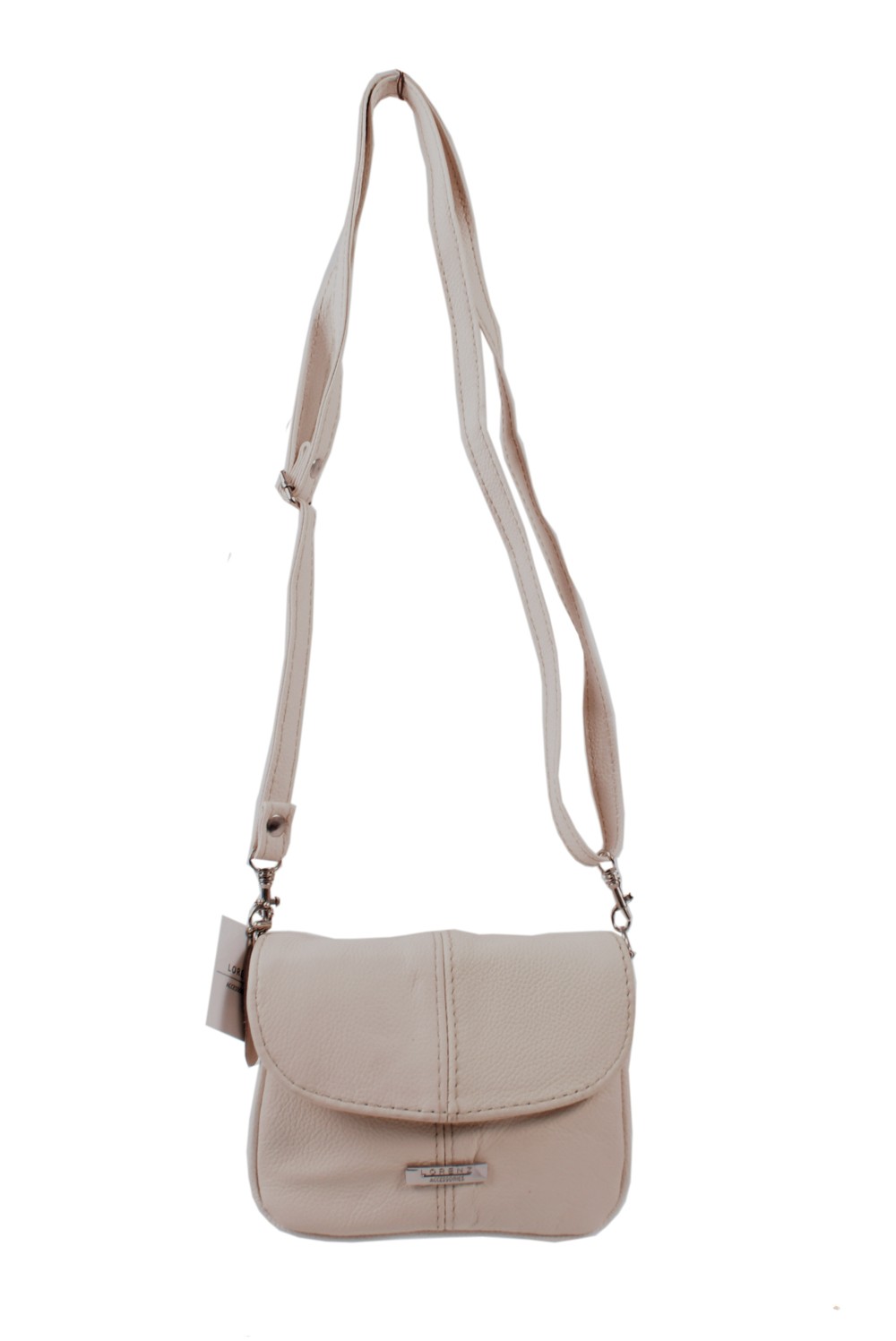 Small Lorenz leather handbag measuring approx 15cm long with a long shoulder strap and the handbag splits into 3 main zipped sections.