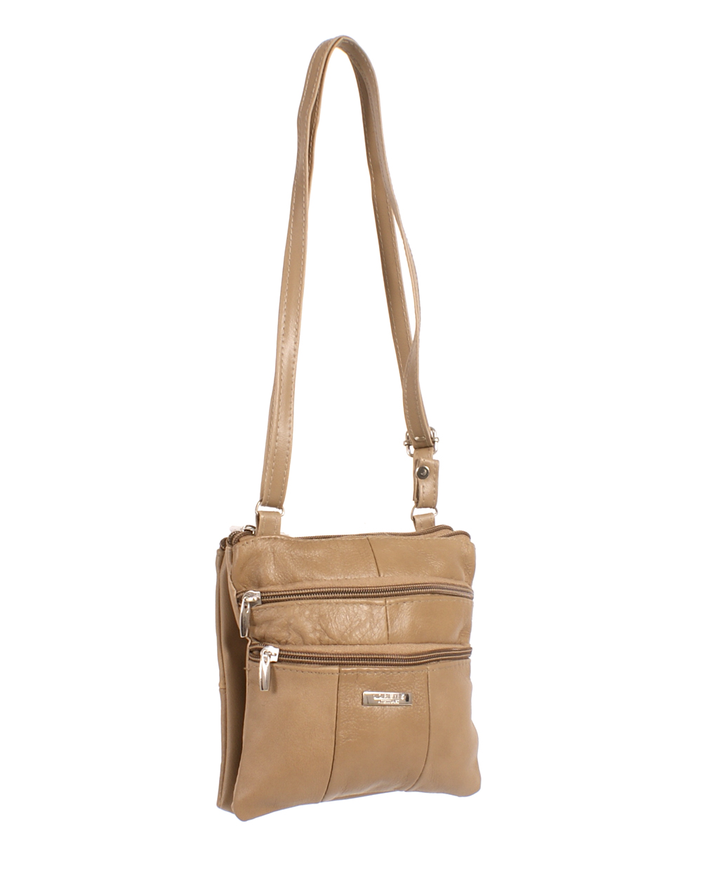 Lorenz leather small cow hide bag with 4 zips. Two main compartments plus two front zip pockets.