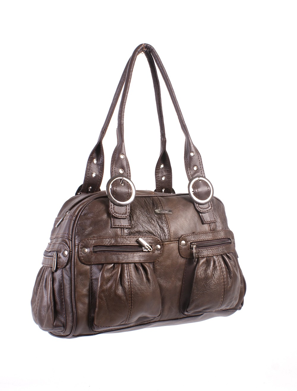 Large leather bag, one main compartment with internal zip pocket and mobile phone pouch, two front zip pockets and two side zip pockets.