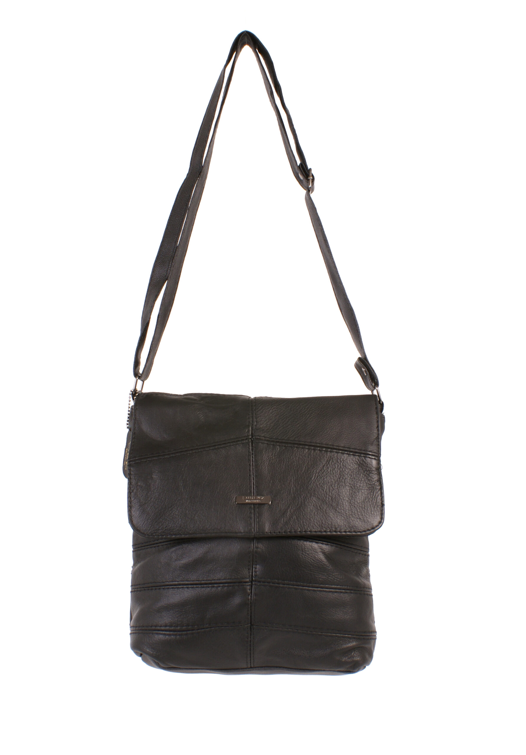 Lorenz cow hide leather bag with a stud press flapover, a main zipped section with an adjustable shoulder strap.