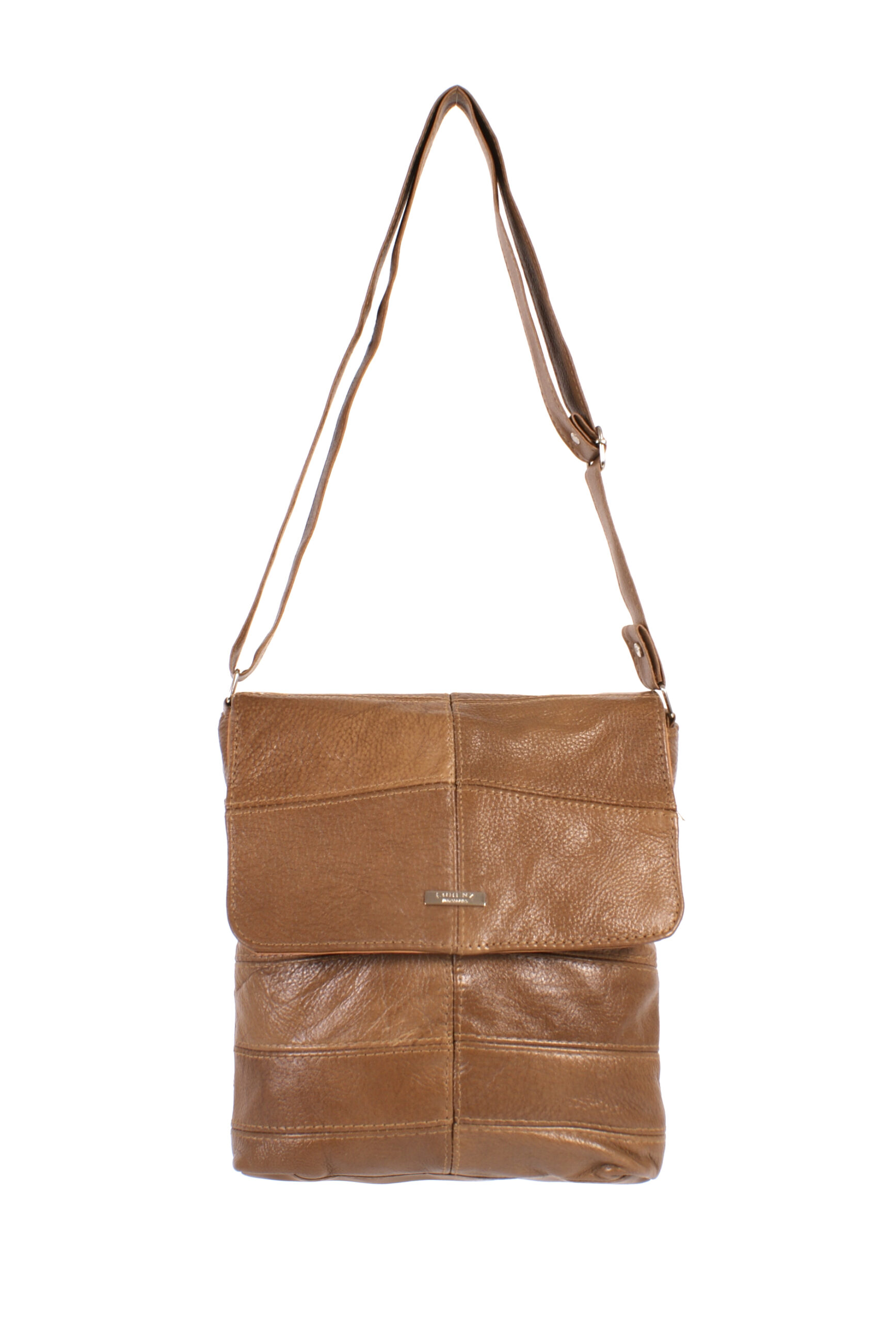 Lorenz cow hide leather bag with a stud press flapover, a main zipped section with an adjustable shoulder strap.