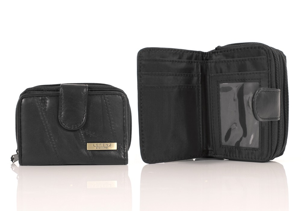 Model: 4621 BLACK Twin Zip Economy Patc Medium sized patchwork leather purse with micro fibre interior featuring zipped concertina purse and a microfibre card section on the back with card slots and ID holder. Product 213/603