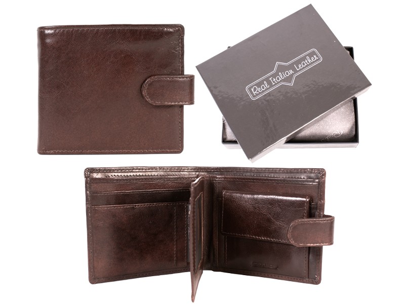 Real Italian Leather mens bi-fold wallet with popper fastening. Features multiple card slots, 1 mesh ID window, a popper fastening coin pocket, two note sections and a zip section inside. Comes in a presentation box. Dimensions: Height 9.5cm Width 11cm Depth 2cm Model: 4766 BROWN ITALIAN LEATHER WALLE Shipping Weight: 0.12lbs