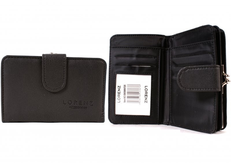Lorenz Accessories 14cm leather grain PU purse features a zip section and twist lock section for your coins. Card holders, note holder and one ID window. 14 x 9 x 2.5 cm Barcode: 5038756133678 Model: 5905 WINTER BLACK