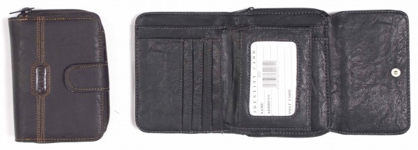 Lorenz black grained pu purse which has a stud button front, This opens up into 3 card slots on the left with 2 internal windows underneath which can be used to store your id. On the right hand side there is a zip change section. There is also a bank notes compartment behind.