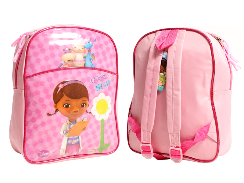 Doc McStuffins backpack with one main zipped compartment, adjustable shoulder straps, top grab handle.