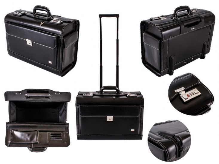 PU leather look matte black traditional large business pilot trolley case. Design makes it the ideal business and travel briefcase trolley. This briefcase is great to keep up appearances and a double combination lock provides security and peace of mind.