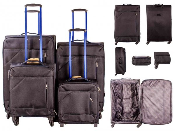 Model: 7004 BLACK/NAVY SET OF 4 TROLLEY 7004 BLACK/NAVY LIGHTWEIGHT SET OF 4 TRAVEL TROLLEY SUITCASES Unisex trolley & Cabin trolley 100% Authentic Suitcases TROLLEY New 4 Wheel Lightweight Suitcase Cabin Trolley -4 WHEELS 360 degrees smooth mobility -STRONG AND DURABLE -PUSH-BUTTON TROLLEY SYSTEM -CROSS BELT INTERIOR -SCRATCH-RESISTANT OUTER SHELL -Exterior Material Made of 100% POLYESTER = Lightweight Yet Durable! -Strong Metal Zippers – Top carry handle for easy grip and easy lifting -One main big compartment with buckle locks for holding the clothes. -Key lock chain for safety. -Expandable for extra space. -Front zipper pocket. -Detachable wheels from 29” trolley Trolley Dimensions :(including Wheels and Fittings): 73.5cm (29 inches) SIZE: Exterior (48 x 28 x 79.5cm) 19 x 11 x 31 inch Interior (47 x 25 x 73.5cm) 18.5 x 10 x 29 inch WEIGHT: 3.8 KG CAPACITY: 110 L 72cm (28 inches) SIZE: Exterior (44.5 x 25.5 x 72cm) 17.5 x 9 x 28 inch Interior (43.5 x 22.5 x66cm) 17 x 9 x 26 inch WEIGHT: 3.8 KG CAPACITY: 110 L 53cm (21 inches) SIZE: Exterior (39 x 20 x 53cm) 15.1 x 8 x 28 inch Interior (38 x17 x 47cm) 15 x 7 x 26 inch WEIGHT: 2.3 KG CAPACITY: 35 L 42cm (16.5 inches) SIZE: Exterior (34 x 19 x 42cm) 13.1 x 7.5 x 16.5 inch Interior (33 x 16 x 38cm) 13 x 6.5 x 15 inch WEIGHT: 2 KG CAPACITY: 22 L Barcode – 3743044 142417 Product 3283/7480