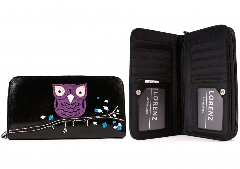 Lorenz Accessories long round PU purse with owl on branch. Features card holders, note holders, two ID windows and a large zip section to hold your coins. 19 x 10 x 3 cm Barcode: 5038756021036 Model: 7103 OWL BLACK