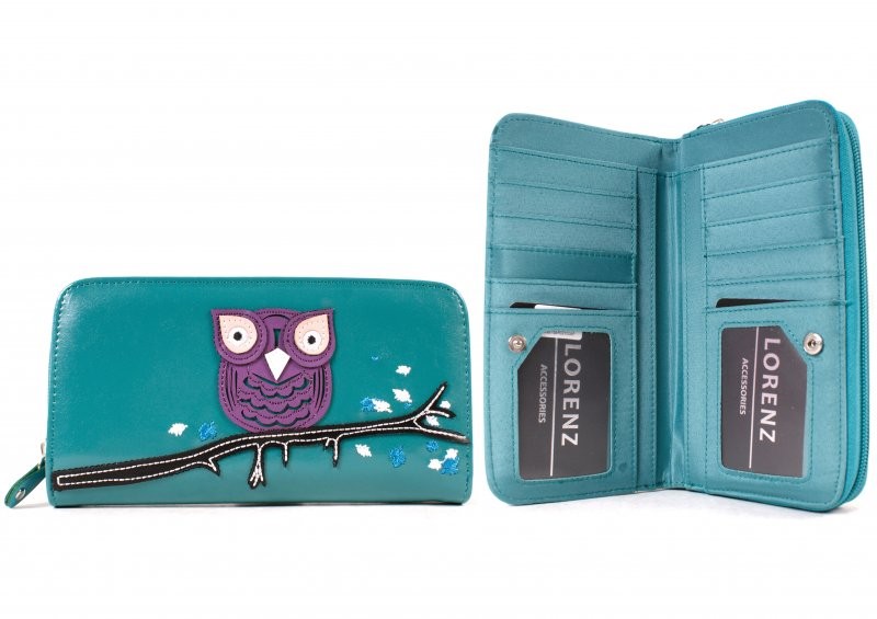 Lorenz Accessories long round PU purse with owl on branch. Features card holders, note holders, two ID windows and a large zip section to hold your coins. 19 x 10 x 3 cm Barcode: 5038756021036 Model: 7103-OWL-TURQUOISE