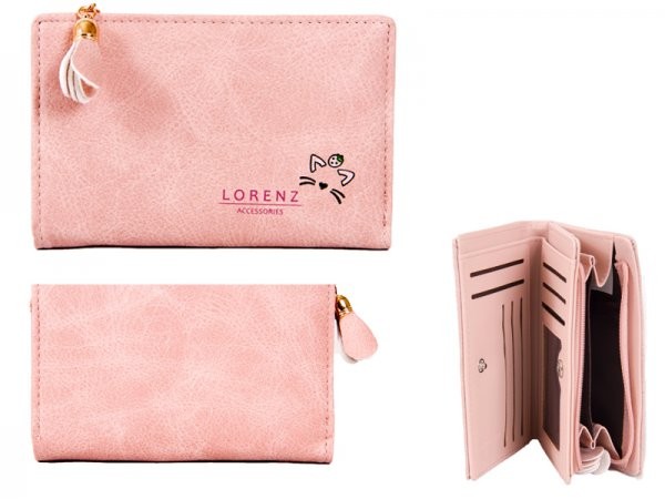 Model: 7141 PINK Medium PU Perse with C Medium Lorenz accessories zipped purse with cat face in right corner and tasselled zip chain, one poppered compartment with Id and card holders with a number of paper money slips and one large zipped compartment. Size 14 x 9 x 2 cm BAR 5038756006019