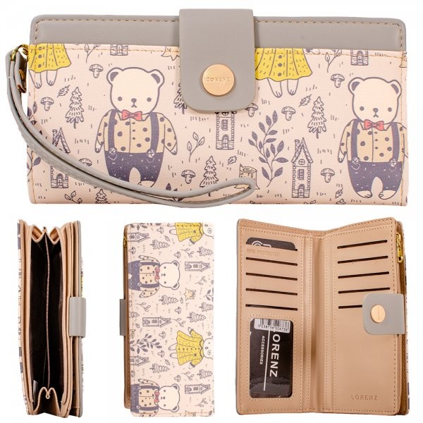 Model: 7251 DENIM BLUE LRG PURSE WALLET 7251 DENIM BLUE TEDDY PRINT LARGE PU WRIST PURSE W/COIN SECTION -This is a Great Value Ladies Purse. -As you can see from the images it also has a really handy wallet section as well as a large change area, an ideal everyday purse. -It has a folding system for extra space and practicality. Its Features in More Detail: -Magnet lock for the main section with 1 open pocket at the front. -9 Credit Card Slots, -4 open pockets under the card section. -Zipped coin Section with 2 open pockets inside -1 Photo/ID Window -1 note pocket -Detachable wristband. -RFID Protected. Dimensions: Approx 19cm x 2.5cm x 10cm (7.5 x 1 x 4 inches) WEIGHT: 0.2KG BARCODE: 5 038756 006736 Product 3487/7639