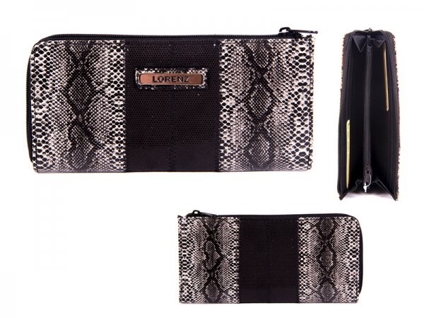 LORENZ purse with snake pvc that is zipped closed and opens up to four large pockets cent beig zipped and a number of card slots. Size 20 x 9.5 x 2 cm Bar 5038756206457