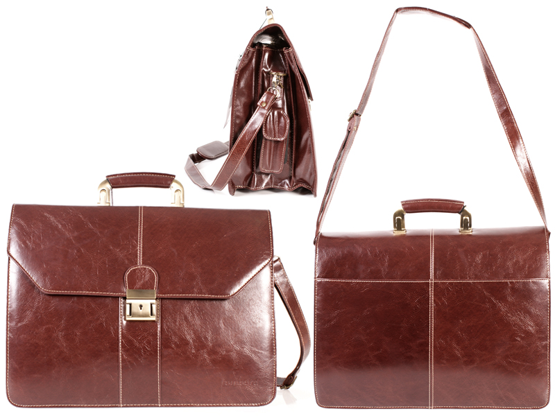 Tassia Lombard London business case with with 3 main compartments under a flap with metal clip fastening, which can be locked with a key. Features a two zipped pockets inside, space for your folders and paperwork, organizer section for pens, cards and notepad. Also features a velcro fastening mobile pocket on the side, a rear pouch pocket, top grab handle and a removable adjustable shoulder strap with a shoulder pad.