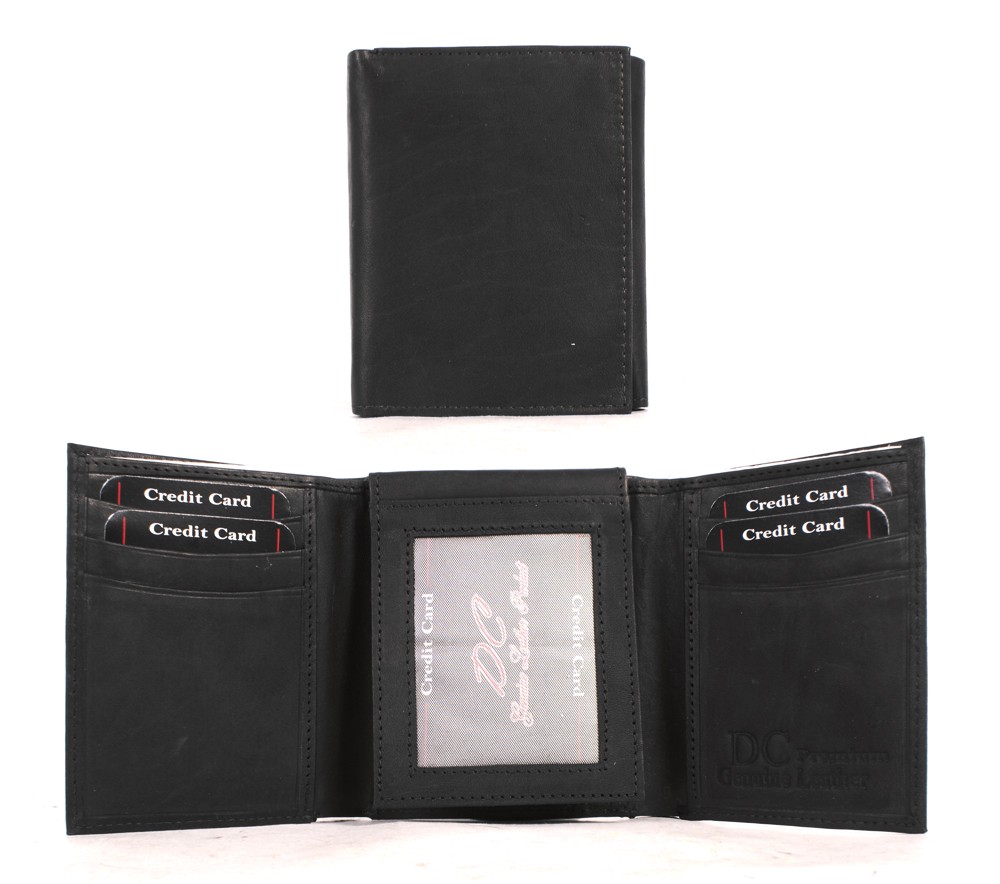 Real leather DC mens tri fold leather wallet.? Features a flip out card holder with many card slots, ID holder on flap and on back and a large cash slot.
