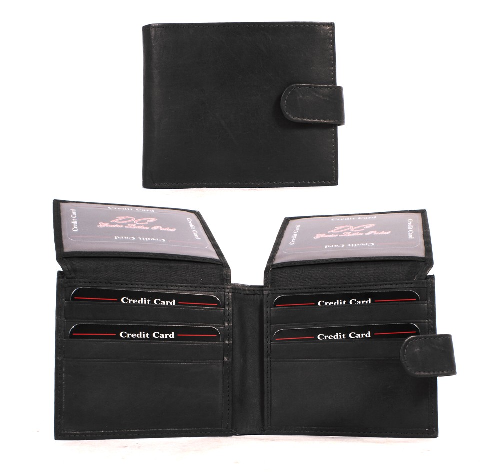 Real leather DC mens bi fold leather wallet.? Features many card slots, 2 ID holders, a large cash slot with stud press closure.