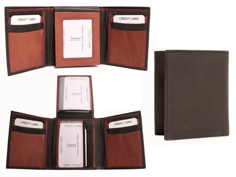 DC by Diva Creations?trifold?premium genuine leather mens wallet with mulitiple card slots, 3 ID windows, a zipped coin section in the middle and a notes section inside.