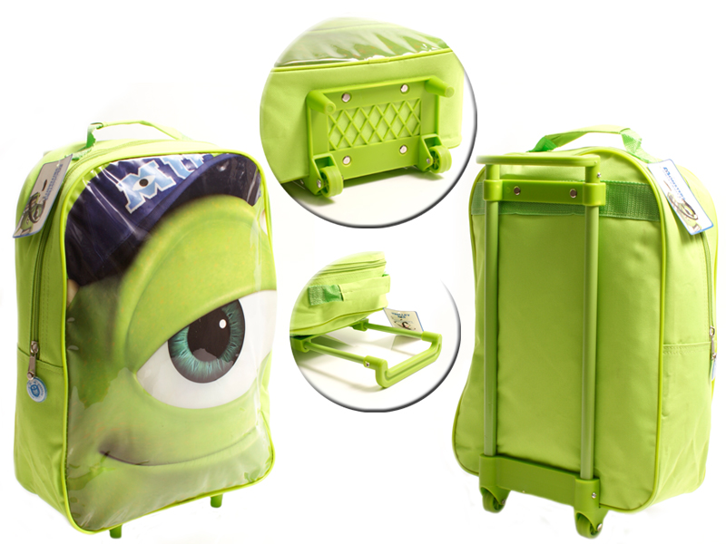 MU trolley bag/wheeled backpack with front pocket and two side mesh pockets.Features pull out handle.