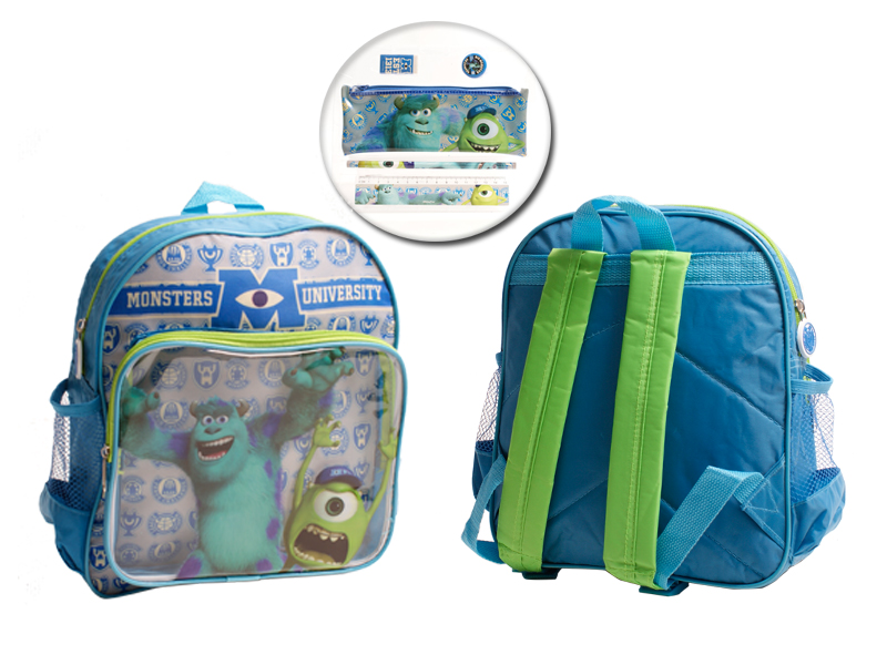 Monsters Inc Uni backpack with stationary in the front compartment, and another zip for the main compartment, also adjustable shoulder straps.