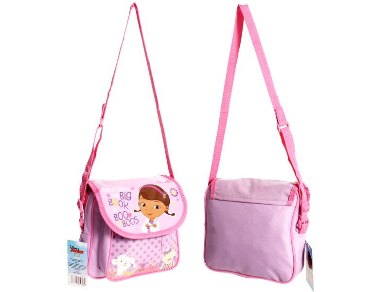 .Doc McStuffins mini despatch bag with adjustable shoulder strap, a velcro fastening on the flap, a main zipped compartment under a flap and a front pocket.