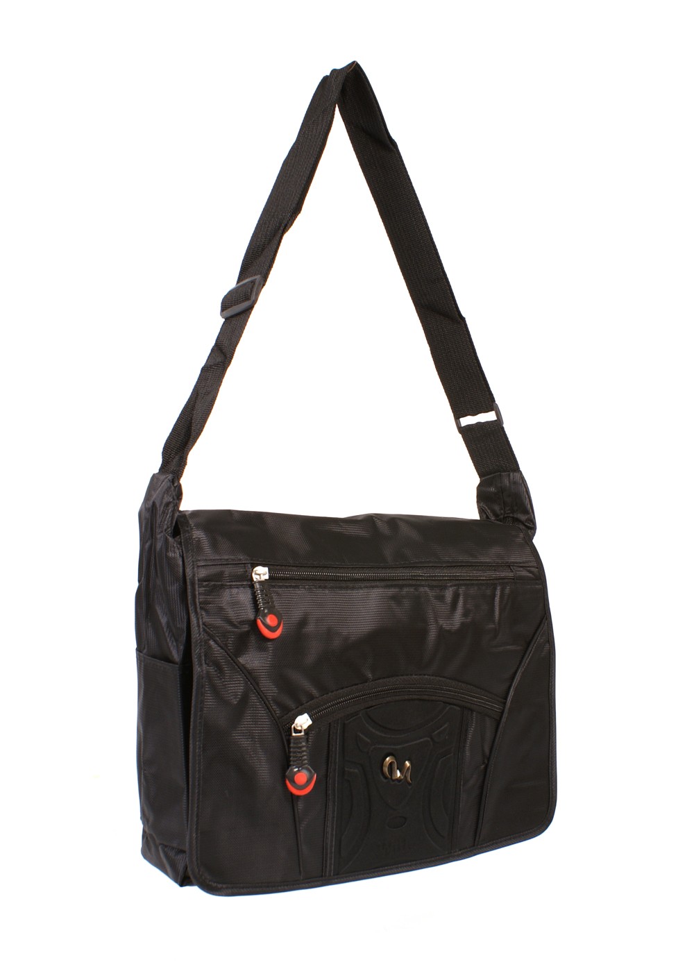 Microfibre school bag with multiple zips and pockets on the front with pen holders and document holders under the flap with an adjustable shoulder strap
