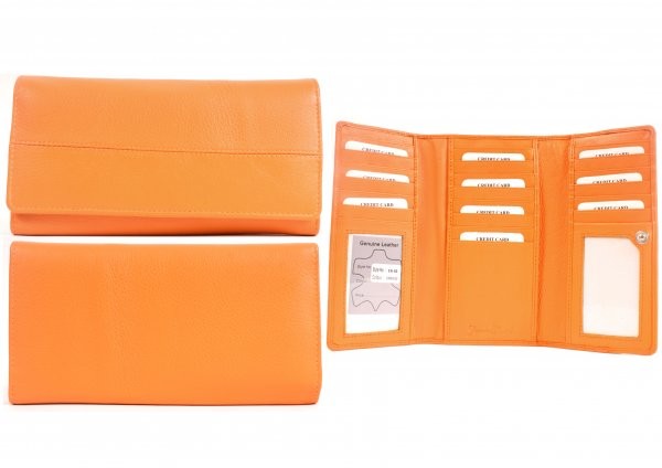 100% genuine leather purse has multiple credit card holders, note holders, two ID windows fastened with a stud.