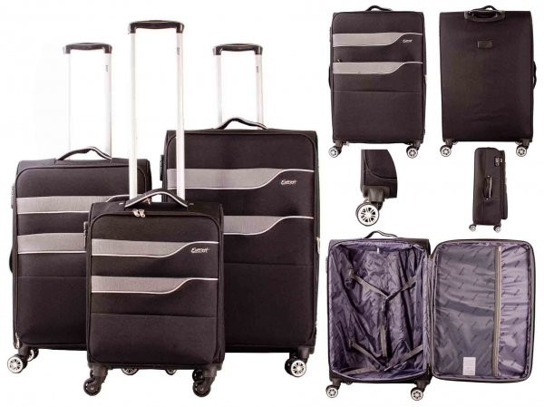 Model: EV-445 BLACK SET OF 3 SUITCASE EV-445 BLACK SET OF 3 TROLLEY SUITCASE LUGGAGE BAG Unisex trolley & Cabin trolley 100% Authentic Suitcases TROLLEY Easy jet- Ryanair Euro Flights New 4 Wheel Lightweight Suitcase Cabin Trolley -4 WHEELS 360 degrees smooth mobility -STRONG AND DURABLE -PUSH-BUTTON TROLLEY SYSTEM -CROSS BELT INTERIOR -SCRATCH-RESISTANT OUTER SHELL -Exterior Material Made of 100% POLYESTER = Lightweight Yet Durable! -Strong Metal Zippers – Top carry handle for easy grip and easy lifting -One main big compartment with buckle locks for holding the clothes. -2 zipper pocket at the front. -One open pocket at the front. -Key lock chain for safety. -Expandable for extra space. -Front zipper pocket. Trolley Dimensions :(including Wheels and Fittings): 72cm (28 inches) SIZE: (77 x 47 x 30 cm) 28 x 18 x 12 inch WEIGHT: 3.85 KG (8.47 lbs) CAPACITY: 100.11 L 66cm (24 inches) SIZE: Exterior (66 x 42 x 27 cm) 24 x 16.5 x 10.5 inch WEIGHT: 3.20 KG (6.82 lbs) CAPACITY: 68.04 L Cabin size (Easy jet- Ryanair Euro Flights) 54cm (20 inches) SIZE: Exterior (54 x 37 x 20 cm) 20 x 14.5 x 8 inch WEIGHT: 2.10 KG (5.06 lbs) CAPACITY: 35.52 L Barcode – 5050774034157 Product 4517/7506